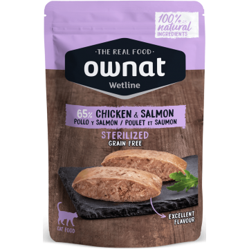Comida húmida de frango e salmão com ingredientes 100% naturais, deliciosa para gatos esterilizados.