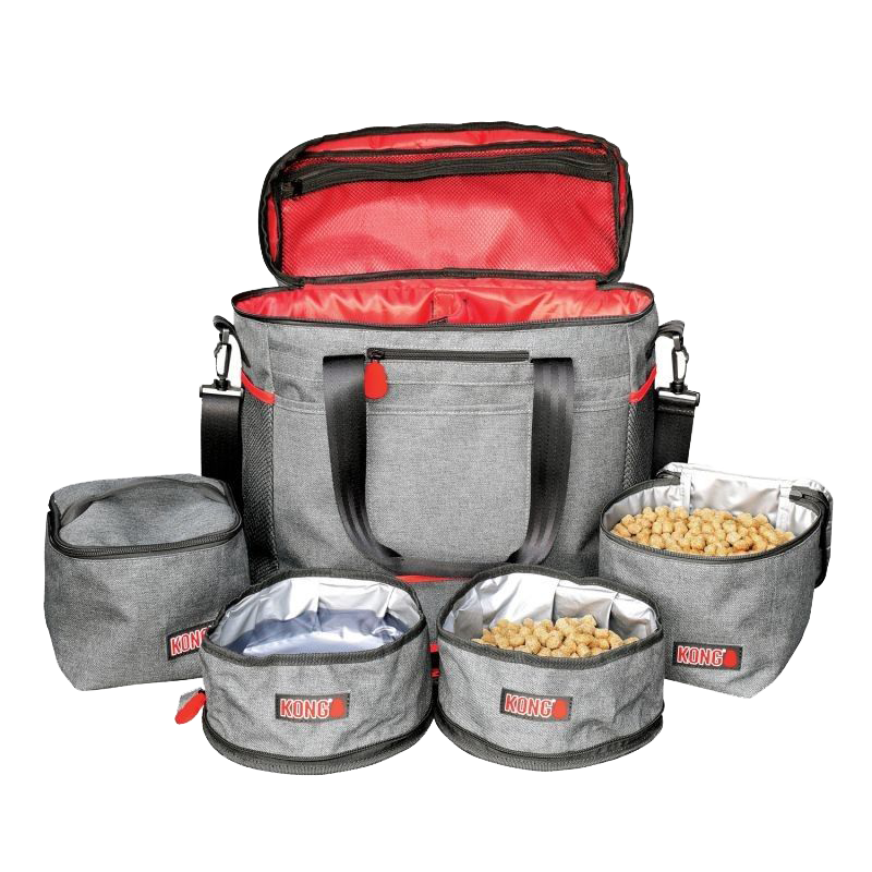 Comedouro, bebedouro e acessórios de viagem KONG. Uma bolsa de viagem com bolsos internos e externos junto com comedouros e bebedouros de viagem.