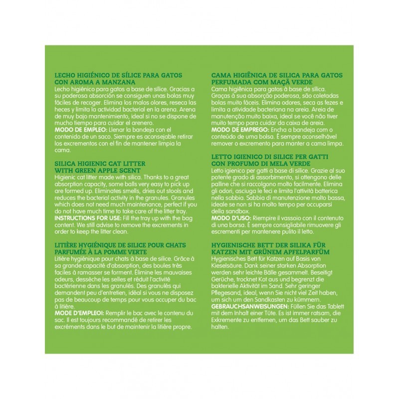 Cama higiênica para gatos à base de areia de sílica aromatizada com Maçã verde. Possui grande capacidade absorvente, absorvendo os maus odores e auxiliando na eliminação de bactérias.