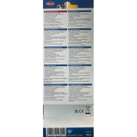 Colar com luz recarregável em modo fixo ou intermitente, fabricado em TPU/nylon com fecho 'click'. É resistente à água e se adapta a diferentes tamanhos com um simples corte. Oferece aproximadamente 5 horas de bateria em modo intermitente e 3 horas em modo fixo. Inclui faixa refletora, cabo USB e chave de fenda.