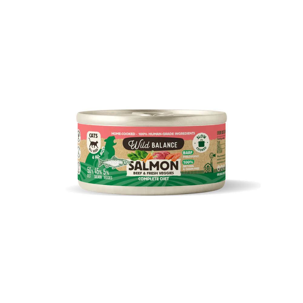 Wild Balance Gato Lata BARF cocinado al vapor SALMÓN y TERNERA con Verduras Frescas