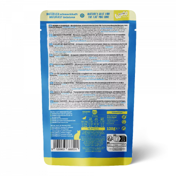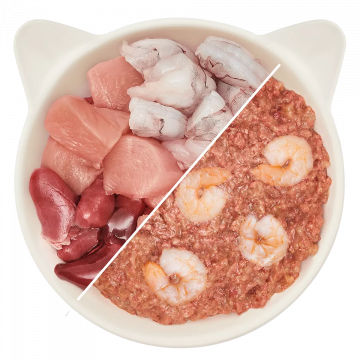 Alimento húmido para gatos adultos com 70% de frango e camarão. Sem cereais e sem conservantes, ideal para manter uma alimentação saudável e saborosa, com uma textura suave e estaladiça.