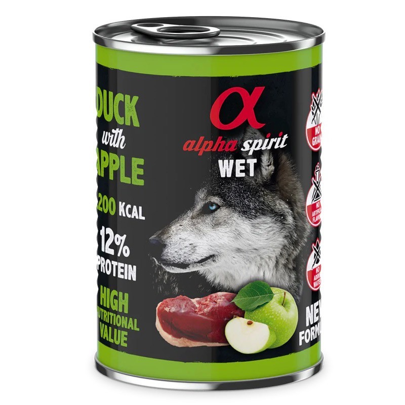 As latas Alpha Spirit Wild Boar e Thyme são um alimento complementar para cães adultos de todos os tamanhos e raças.