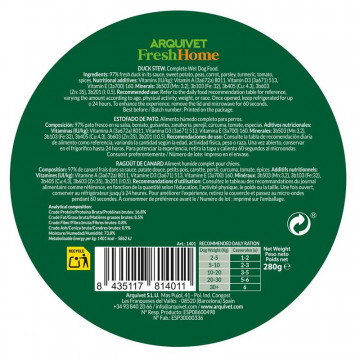 Arquivet Fresh Home Estufado de Pato | Comida natural para cães Peso 280 gr