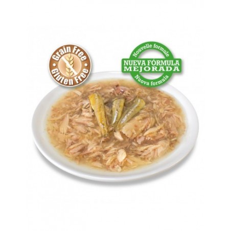 Comida úmida para gatos à base de Atum branco e frango em molho. Sem cereais e sem glúten. De grande apetência e feito com ingredientes de qualidade.