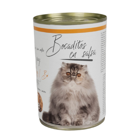 Lata de 415 gramas de atum e cereais em molho para gatos de todas as idades e raças.