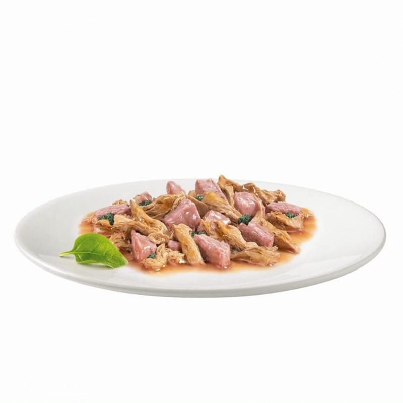 Bocados finos de peixes cortados em tiras finas, cozidos com seu saboroso molho para reter o sabor do mar e elegantemente combinados com tentadores camarões inteiros para deleitar o paladar refinado do seu gato.
