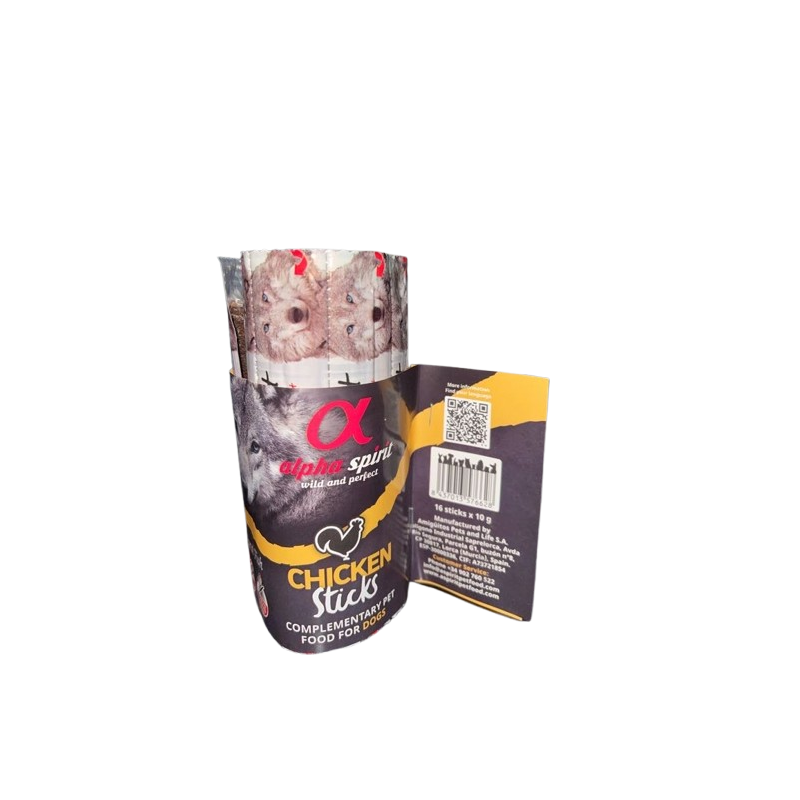 ALPHA SPIRIT STICKS para cães são feitos com ingredientes naturais. Uma recompensa sinónimo de qualidade de vida para o seu cão. Fácil de manusear e conservar.