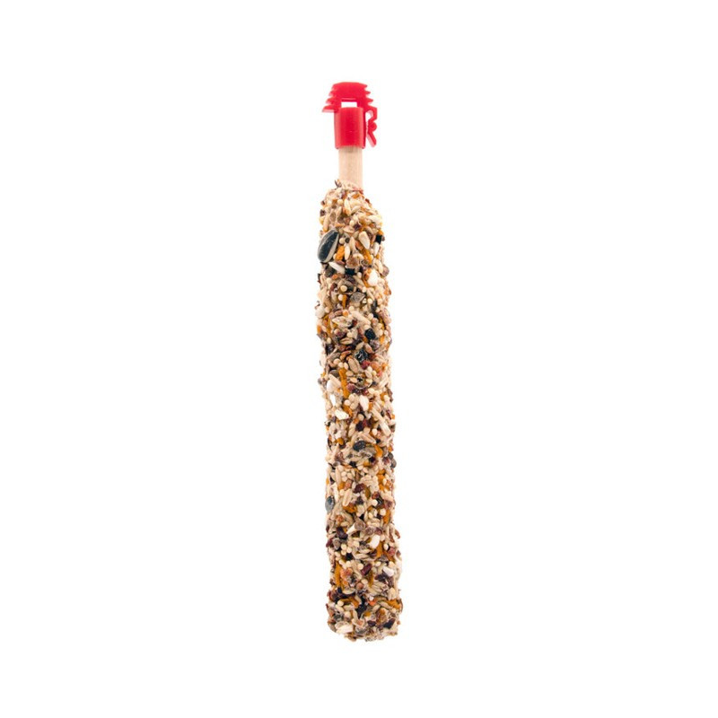 Formato 2 barras de sementes assadas de 30 gr com mistura de frutas e flores para periquitos e papagaios pequenos. Lanche sem açúcar.
