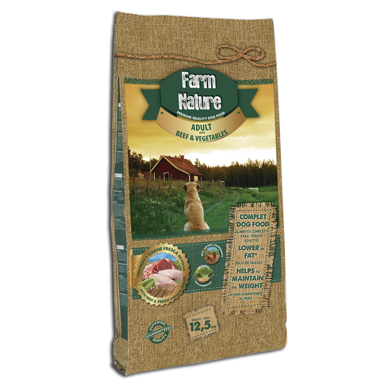 FARM NATURE O alimento para cães Beef, Chicken & Vegetables é recomendado para cães adultos de qualquer raça, a partir de 1 ano de idade. Este alimento balanceado é adequado para uma dieta diária. A carne bovina é uma carne magra e é por isso que esta ração contém menos gordura e permite controlar o peso do seu cão. Com arroz e frango fresco, é altamente digerível e ideal para aliviar o sistema digestivo do seu animal de estimação. Com prebióticos e antioxidantes naturais, preserva e fortalece funções vitais, como coração, sistema digestivo e imunológico. Apresenta ácidos graxos essenciais (ômega 3 e 6) para cabelos brilhantes e pele saudável.
