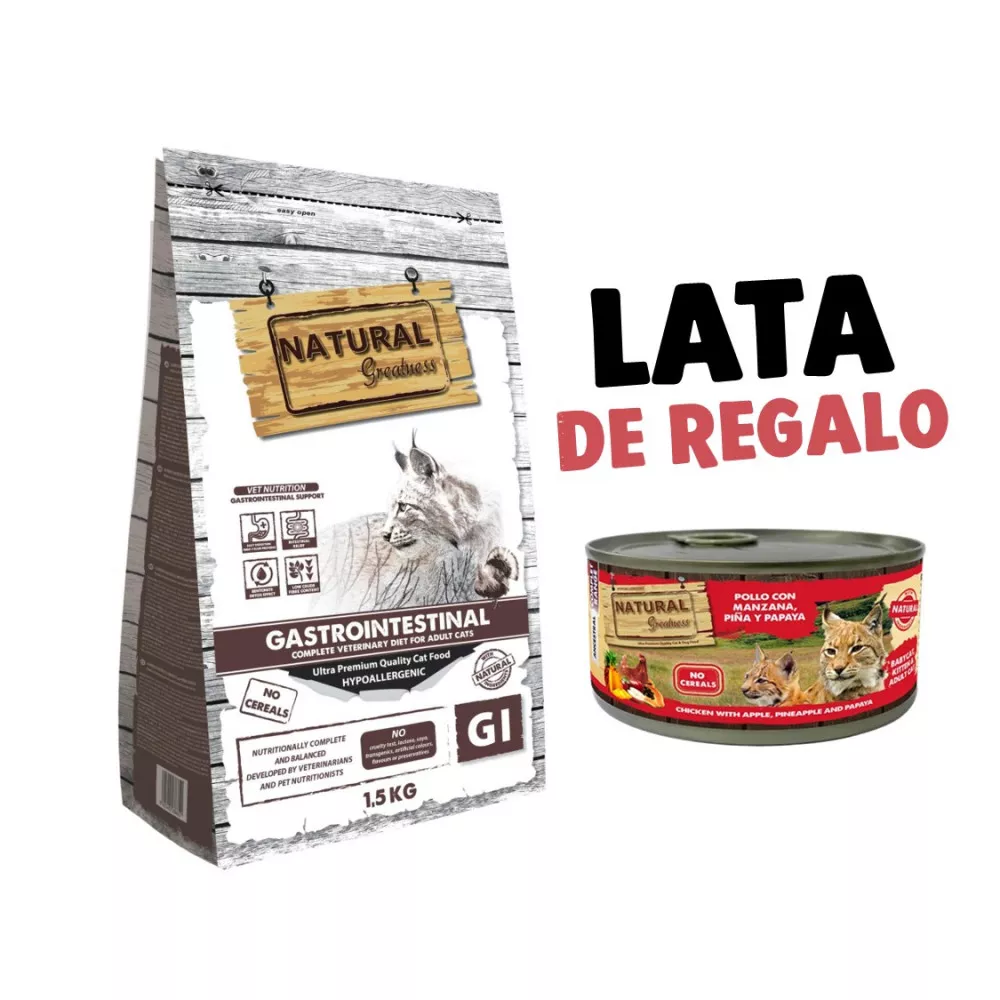 Natural Greatness Gastrointestinal é uma receita completa, hipoalergénica e sem grãos para gatos adultos com distúrbios de absorção intestinal. Este alimento caracteriza-se pela presença de prebióticos MOS para uma melhor absorção de nutrientes, bem como uma elevada digestibilidade devido ao aumento do teor de sódio e potássio e proteínas de elevado valor biológico de origem animal. Destaca a utilização de outros ingredientes naturais tais como maçã, abóbora, ameixa, camomila, salva ou orégãos, ricos em vitaminas, minerais e antioxidantes, com propriedades anti-inflamatórias para promover uma boa digestão.