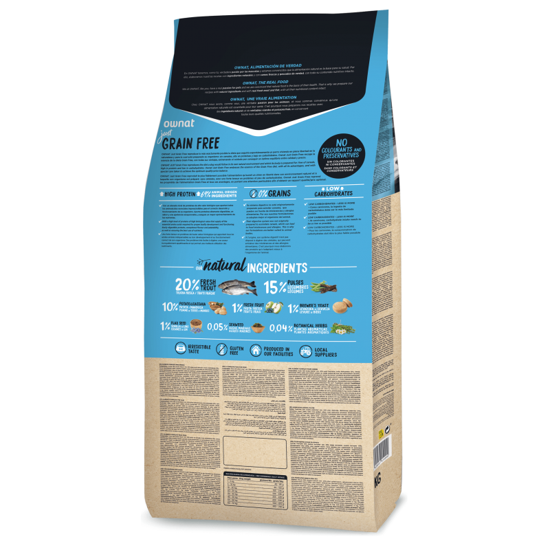 Truta 32% (truta fresca * min. 20% antes da extrusão, truta desidratada 12%), carnes desidratadas (28%), ervilhas inteiras *, gordura de ave (conservada com antioxidantes naturais) , batata desidratada *, vagem de alfarroba *, raízes de mandioca *, proteína de frango hidrolisada, polpa de beterraba, levedura de cerveja *, maçã fresca * (1%), semente de linho *, alfafa desidratada *, óleo de peixe (preservado com antioxidantes naturais), sal-gema *, oligossacarídeos de fruto e manana, algas marinhas desidratadas * , glucosamina, condroitina, yucca schidigera, mirtilos *, tomilho *, flor de camomila *, erva-doce *, equinácea *, chá verde *. * Ingredientes naturais