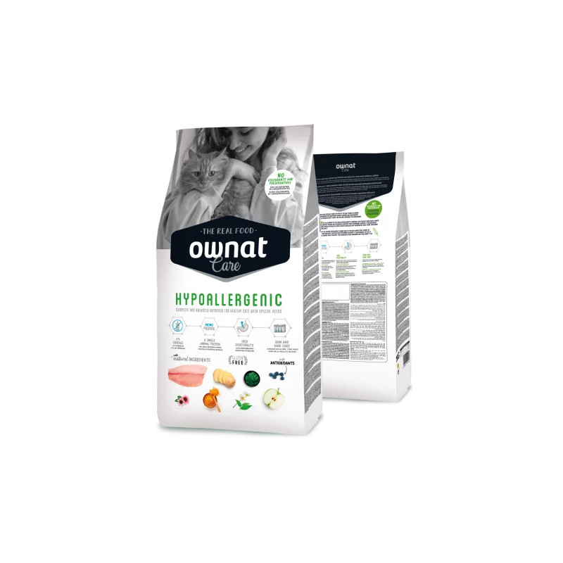 O OWNAT CARE HYPOALLERGENIC é um alimento premium especialmente formulado com peixe como única fonte de proteína animal e isento de cereais.