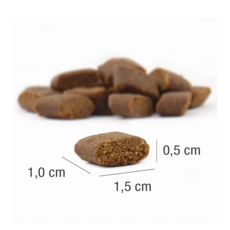 Ração para mini filhotes, feita com arroz e frango fresco, com um sabor atraente para seu mini filhote. Com 18% de umidade residual, é um alimento seco e suculento.
