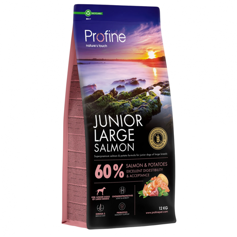 Salmão 42% (salmão moído 26%, proteína de salmão 16%), milho, batata (15%), maçãs secas, gordura de frango (conservada com tocoferóis mistos, fonte de vitamina E), levedura de cerveja, óleo de salmão (3%), fígado de frango hidrolisado (2%), camarão (1, 5%), algas (0,5%), sulfato de glucosamina (0,025%), raízes de chicória (fonte de manano-oligossacarídeos 0,02%), mistura de ervas (funcho, manjericão, salva 0,02%), fructo-oligossacarídeos (0,015%), extracto de yucca schidigera (0,015%), sulfato de condroitina (0,015%).