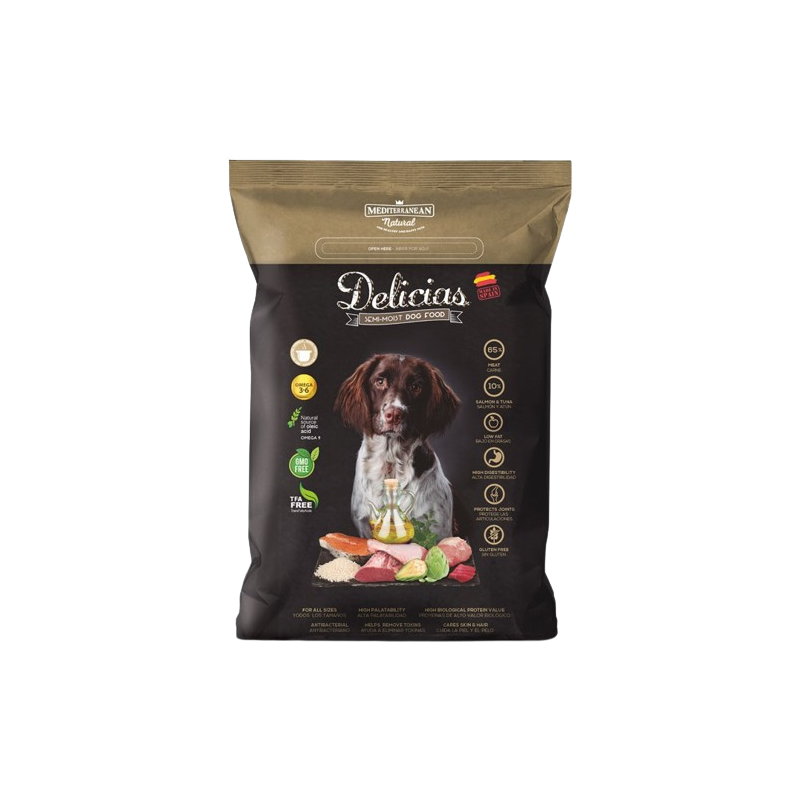 Alimento completo semi-úmido para cães adultos com alta palatabilidade e digestibilidade.