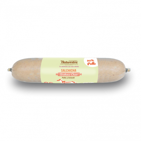 Salsichas de frango com legumes. Um alimento completo muito apetecível para todos os tipos de cães, que fornece energia e favorece um metabolismo saudável. 90% de carne de frango. Sem cereais e sem glúten.