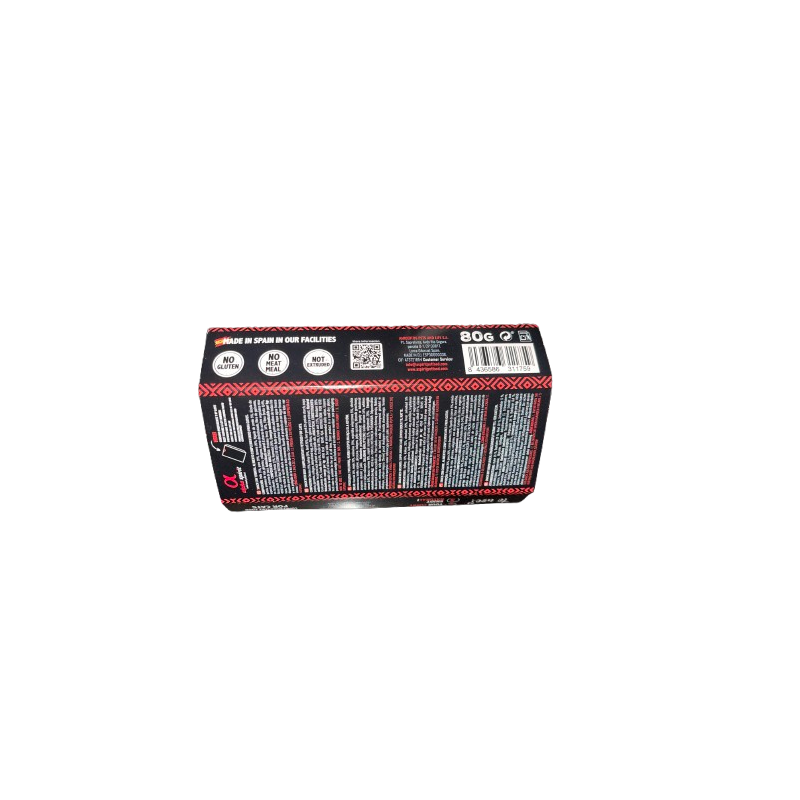 Frango 35%, peru 25%, peixe fresco 20% (salmão 14%), fécula de batata, proteína de soja, glicina, colagénio, ovo seco, fibra de ervilha, especiarias, extrato de yucca.