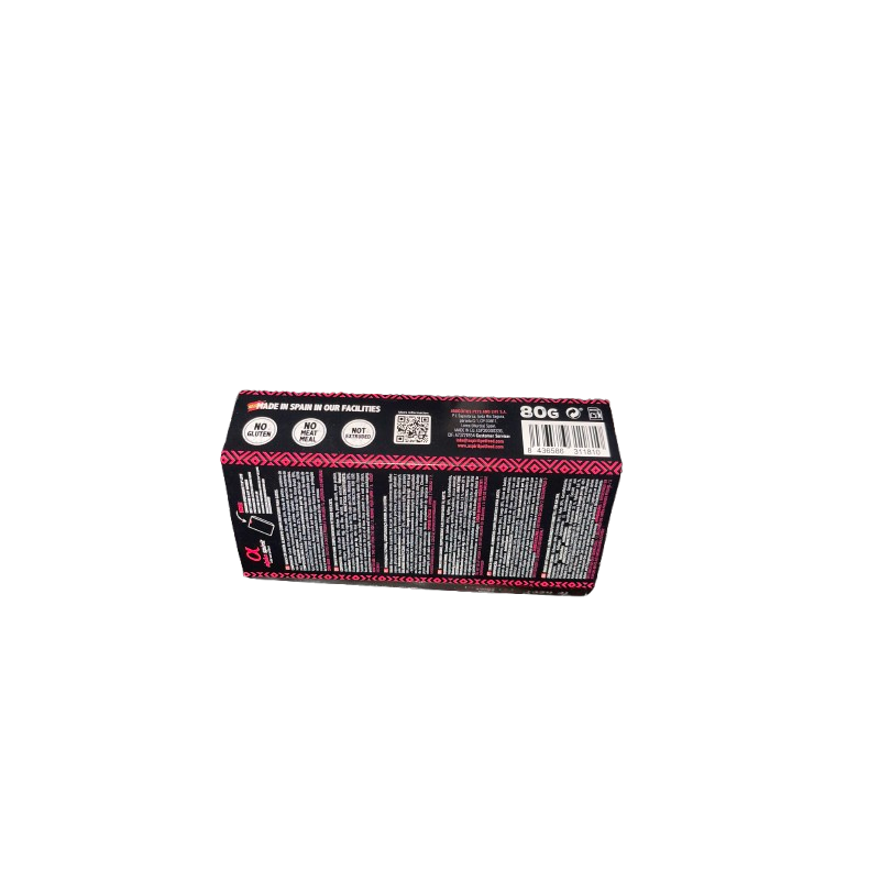 Frango 35%, peru 25%, peixe fresco 20% (salmão 14%), fécula de batata, proteína de soja, glicina, colagénio, ovo seco, fibra de ervilha, especiarias, extrato de yucca.