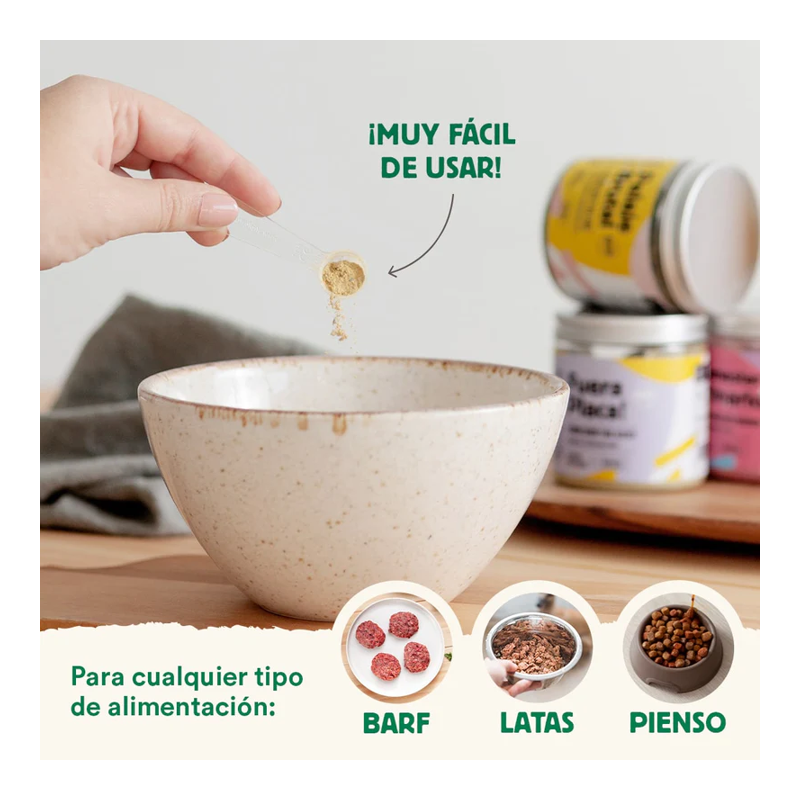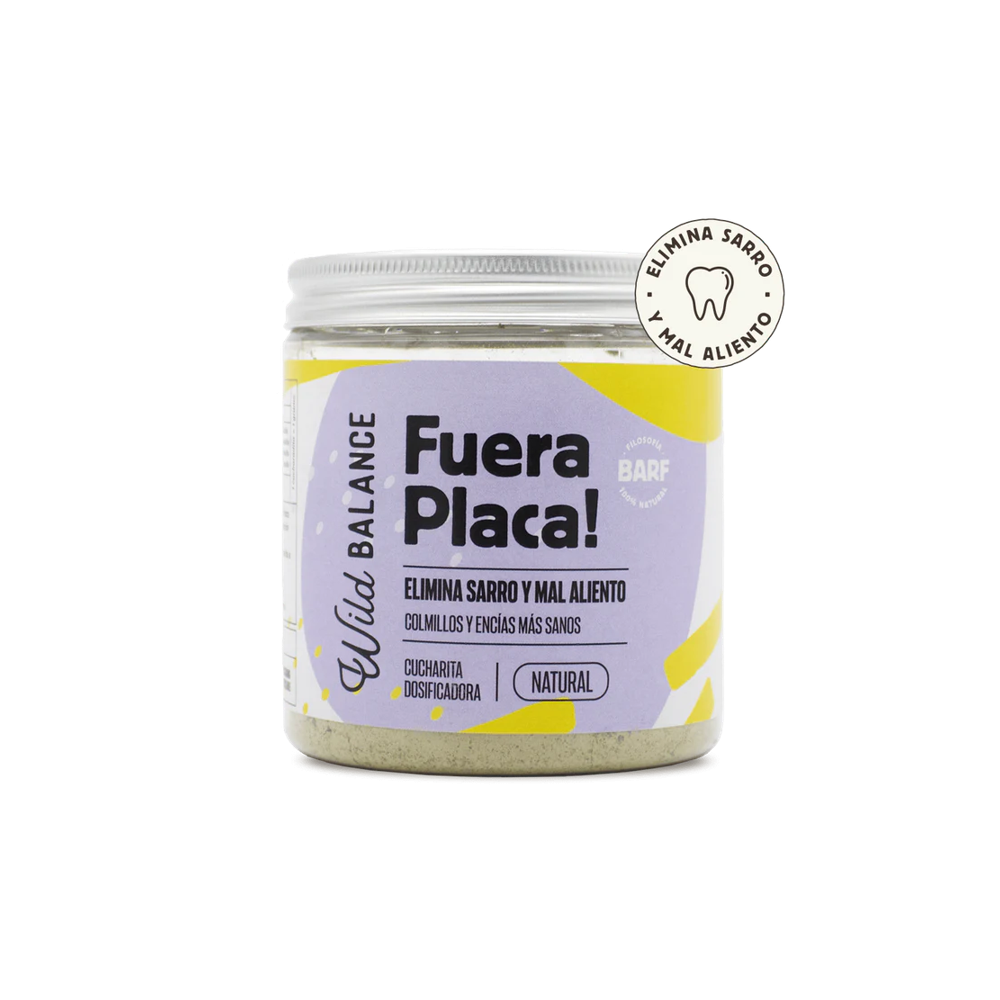 FORA PLACA! é um produto natural à base de algas marinhas e vários suplementos que ajudam a manter uma higiene bucal correta do seu animal de estimação. Este suplemento anti-sarro elimina a placa bacteriana e melhora o mau hálito.